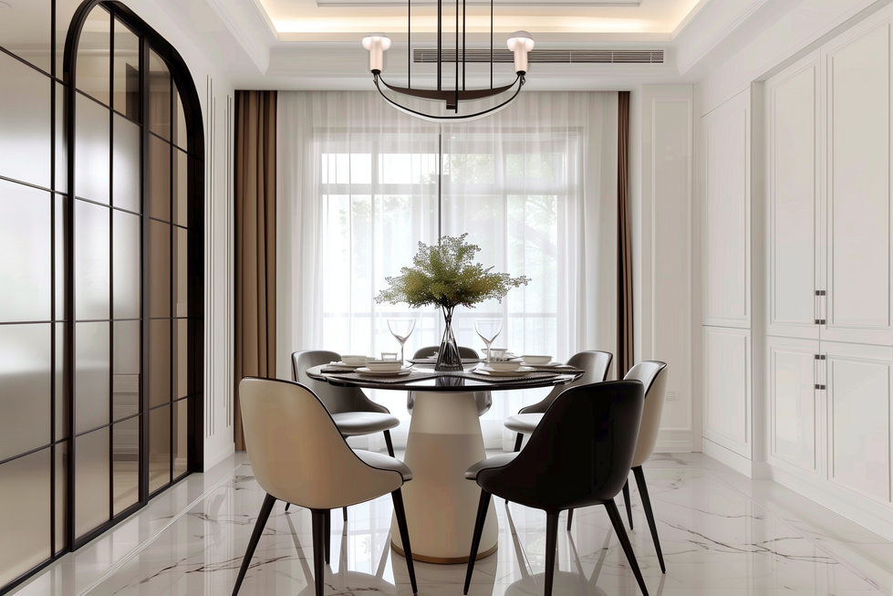 The French light luxury ambiance crafted in an ivory and black palette elevates the elegance and refinement of French style to perfection. The interplay of gloss and depth in the space, alongside flawlessly executed molding details, effortlessly outlines a pure and timeless French elegance.
